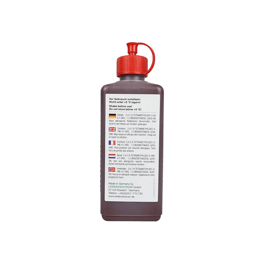 Краска для кожи изготовлена на водной основе и, если следовать инструкциям в каждом конкретном случае (предварительная очистка, растворение, грунтовка, покрытие прозрачным лаком), обеспечивает отличную адгезию и укрывистость. Краситель для кожи одобрен для поверхностного окрашивания автомобильной кожи, мебельной кожи и авиационной кожи. Доступен в базовых цветах, а также в виде смеси специальных цветов.