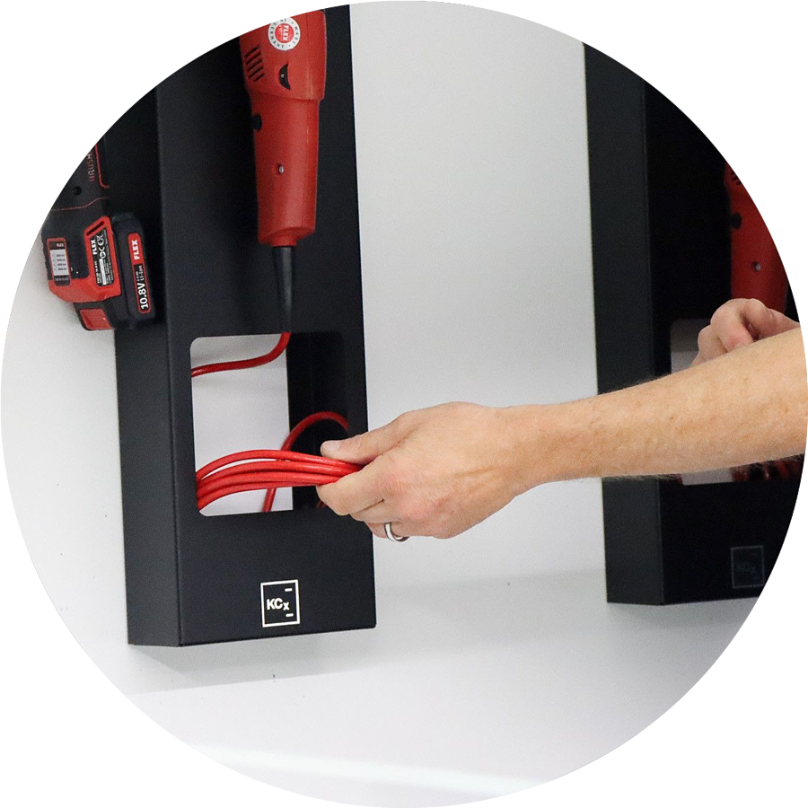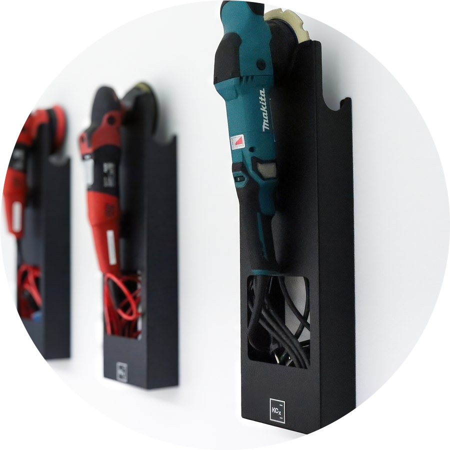 Держатель Polisher Holder позволяет компактно подвешивать полировальные машинки, есть резиновая прокладка. Выемка в нижней части держателя обеспечивает оптимальную укладку кабеля. Предназначен для эксцентриковых и ротационных полировальных машин с диаметром диска до 180 мм, боковые углубления позволяют подвешивать небольшие полировальные машинки. Изделие изготовлено из оцинкованного металла с порошковым покрытием толщиной 1,5 мм