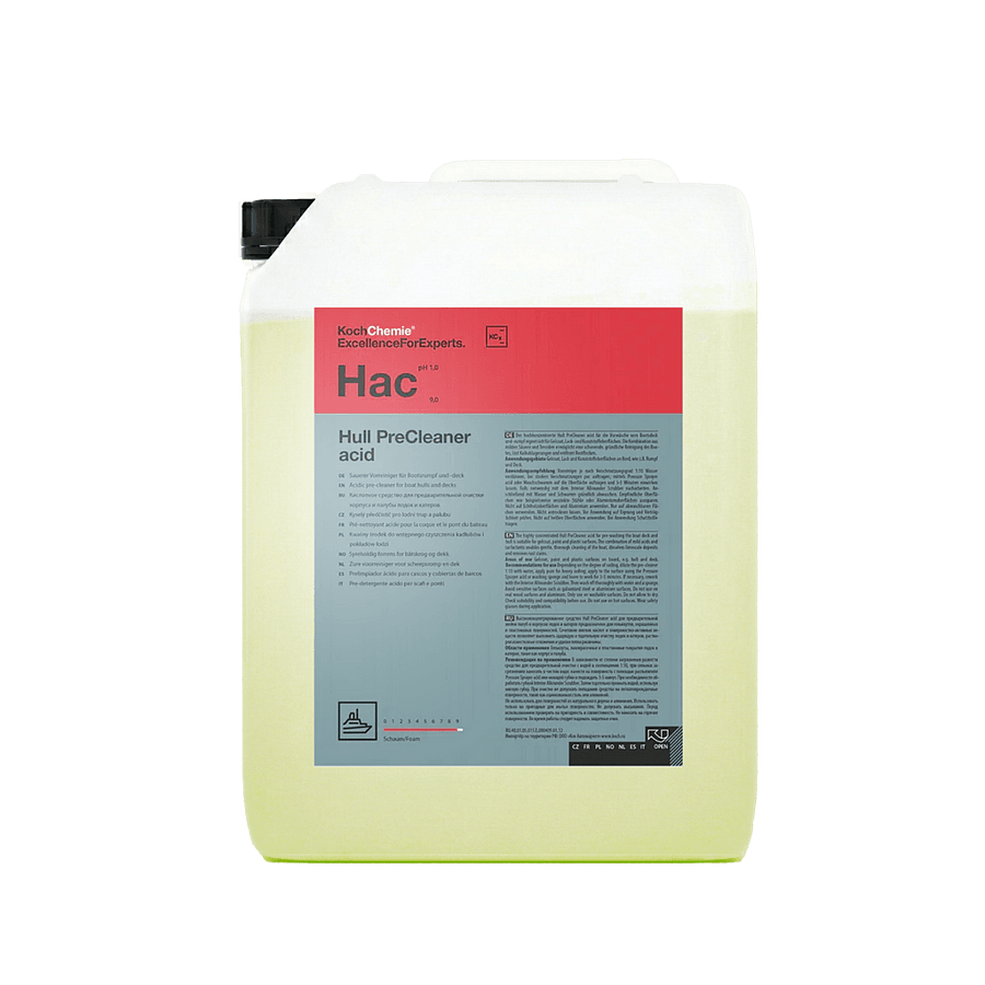 Высококонцентрированное средство Hull PreCleaner acid для предварительной мойки палуб и корпусов лодок и катеров предназначено для гелькоутов, окрашенных и пластиковых поверхностей, а также для очистки нержавеющей стали. Сочетание мягких кислот и поверхностно-активных веществ позволяет выполнять щадящую и тщательную очистку лодок и катеров, растворяя известковые отложения и удаляя пятна ржавчины.